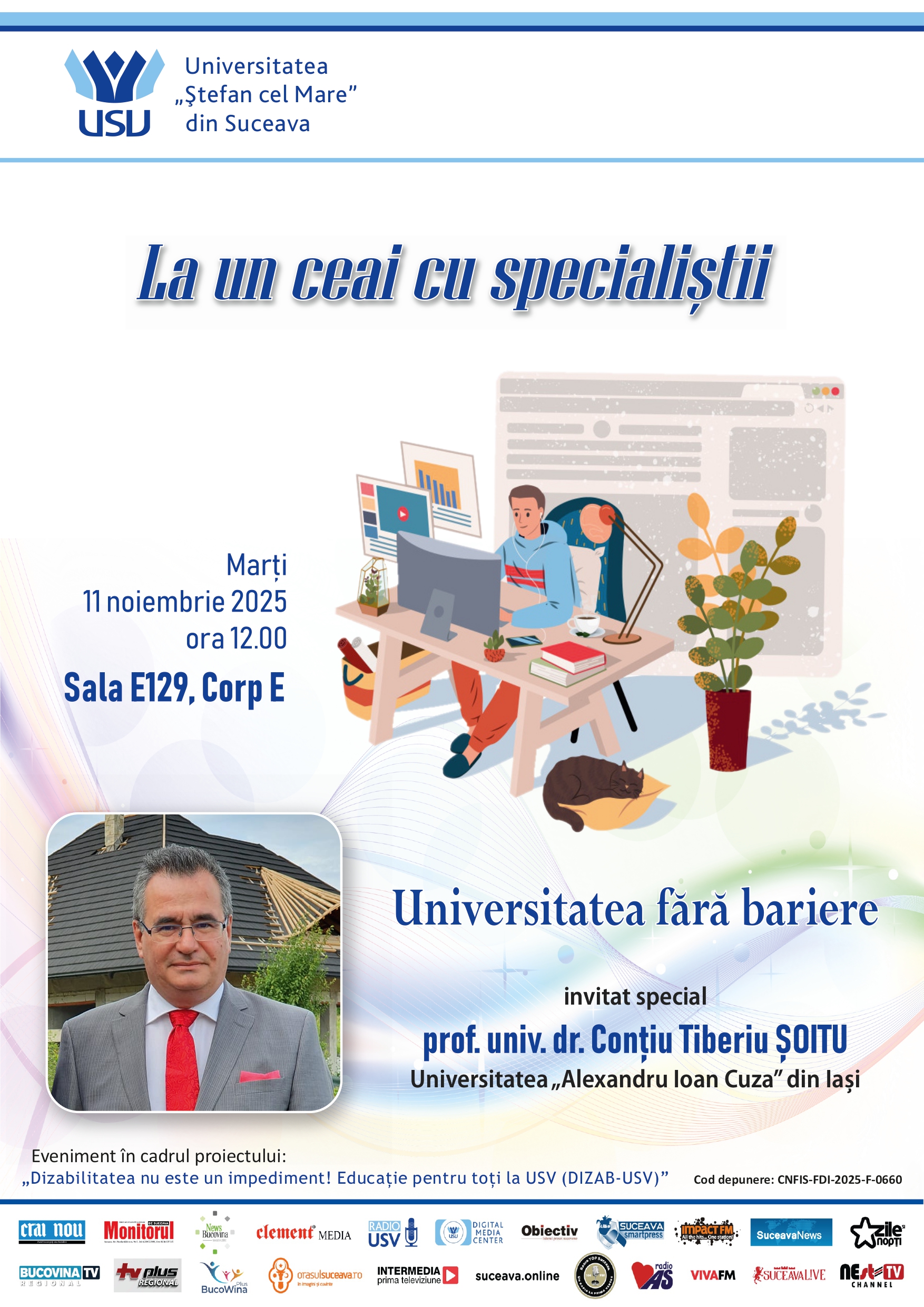 Marți, 11 noiembrie a.c., începând cu ora 12:00, în sala E129, Universitatea „Ștefan cel Mare” din Suceava (USV) organizează evenimentul „La un ceai cu specialiștii”, adresat studenților cu dizabilități, celorlalți studenți, cadrelor didactice, personalului didactic auxiliar, personalului de cercetare de la șase facultăți sucevene: Facultatea de Economie, Administrație și Afaceri,, Facultatea de Inginerie Alimentară, Facultatea de Drept și Științe Administrative, Facultatea de Educație Fizică și Sport, Facultatea de Psihologie și Științe ale Educației și Facultatea de Istorie, Geografie și Științe Sociale.