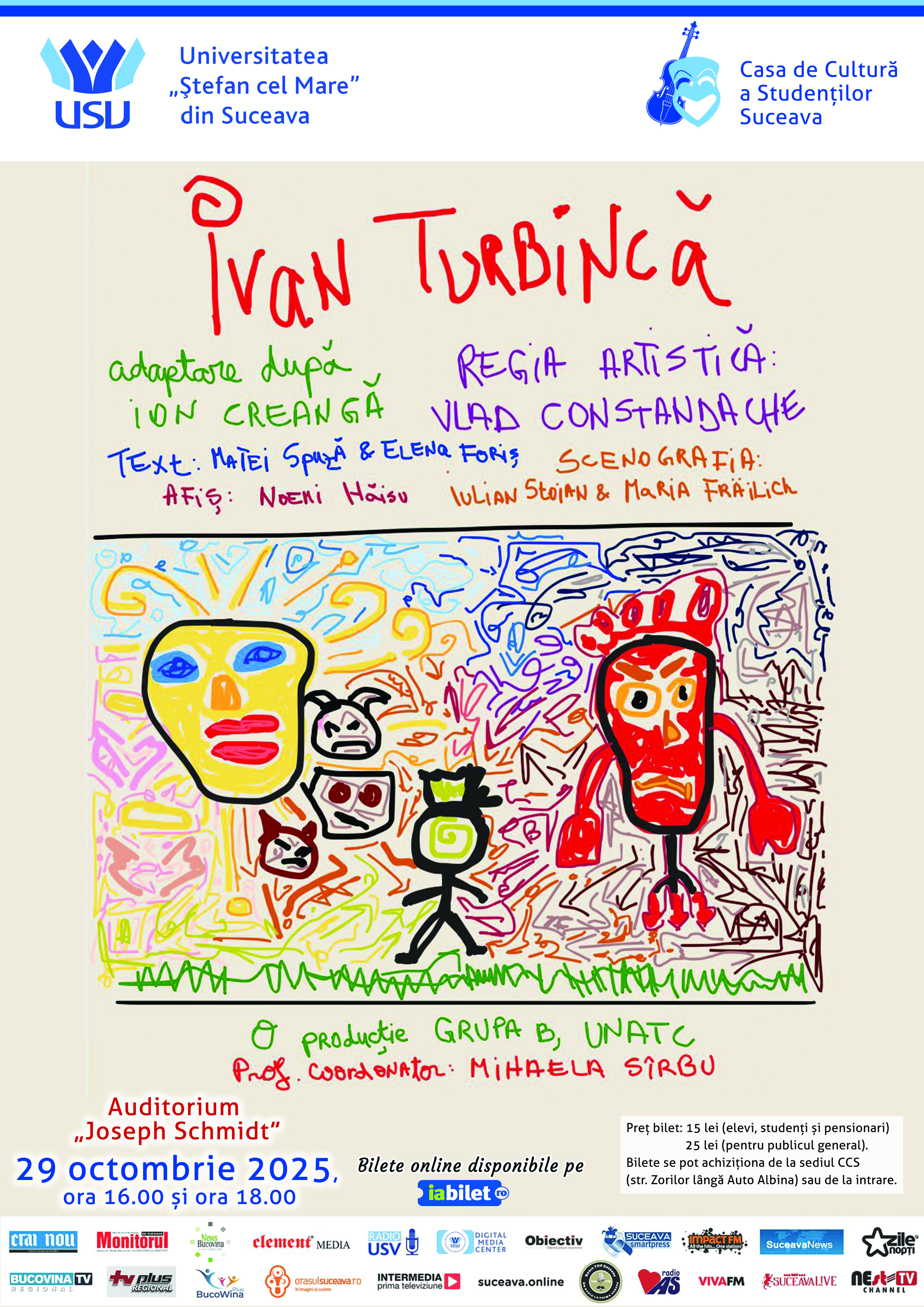 Casa de Cultură a Studenților Suceava și Universitatea „Ștefan cel Mare” din Suceava, în parteneriat cu Universitatea Națională de Artă Teatrală și Cinematografică – Grupa B, vă invită la spectacolul „Ivan Turbincă”, o adaptare inedită după povestea nemuritoare a lui Ion Creangă.