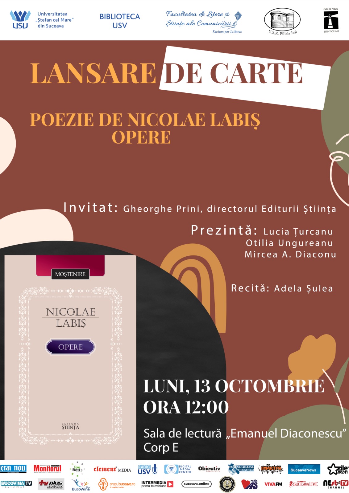 Luni, 13 octombrie a.c., de la ora 12:00, Biblioteca Universității „Ștefan cel Mare” din Suceava invită publicul în Sala de lectură „Emanuel Diaconescu” din corpul E, unde va avea loc lansarea volumului Nicolae Labiș. Opere, apărut la Editura Știința din Chișinău, în cadrul prestigioasei colecții Moștenire.