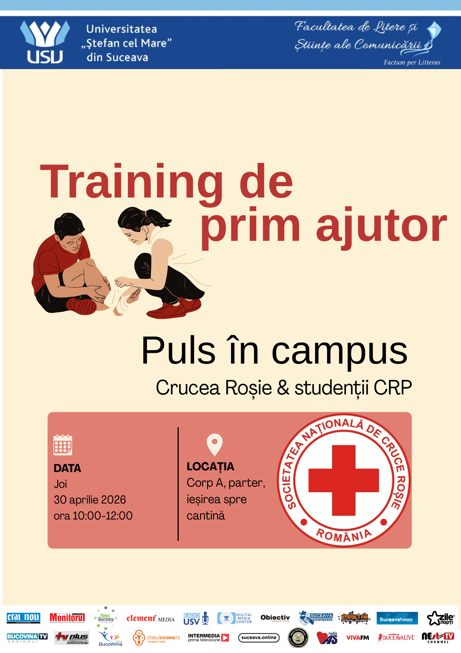 Facultatea de Litere şi Ştiinţe ale Comunicării, programul de studiu Comunicare şi relaţii publice, în parteneriat cu Crucea Roşie, organizează trainingul ,,Puls în campus”, care va avea loc mâine, 30 aprilie, în intervalul 10:00 – 12:00, pe holul corpului A, la parter.
