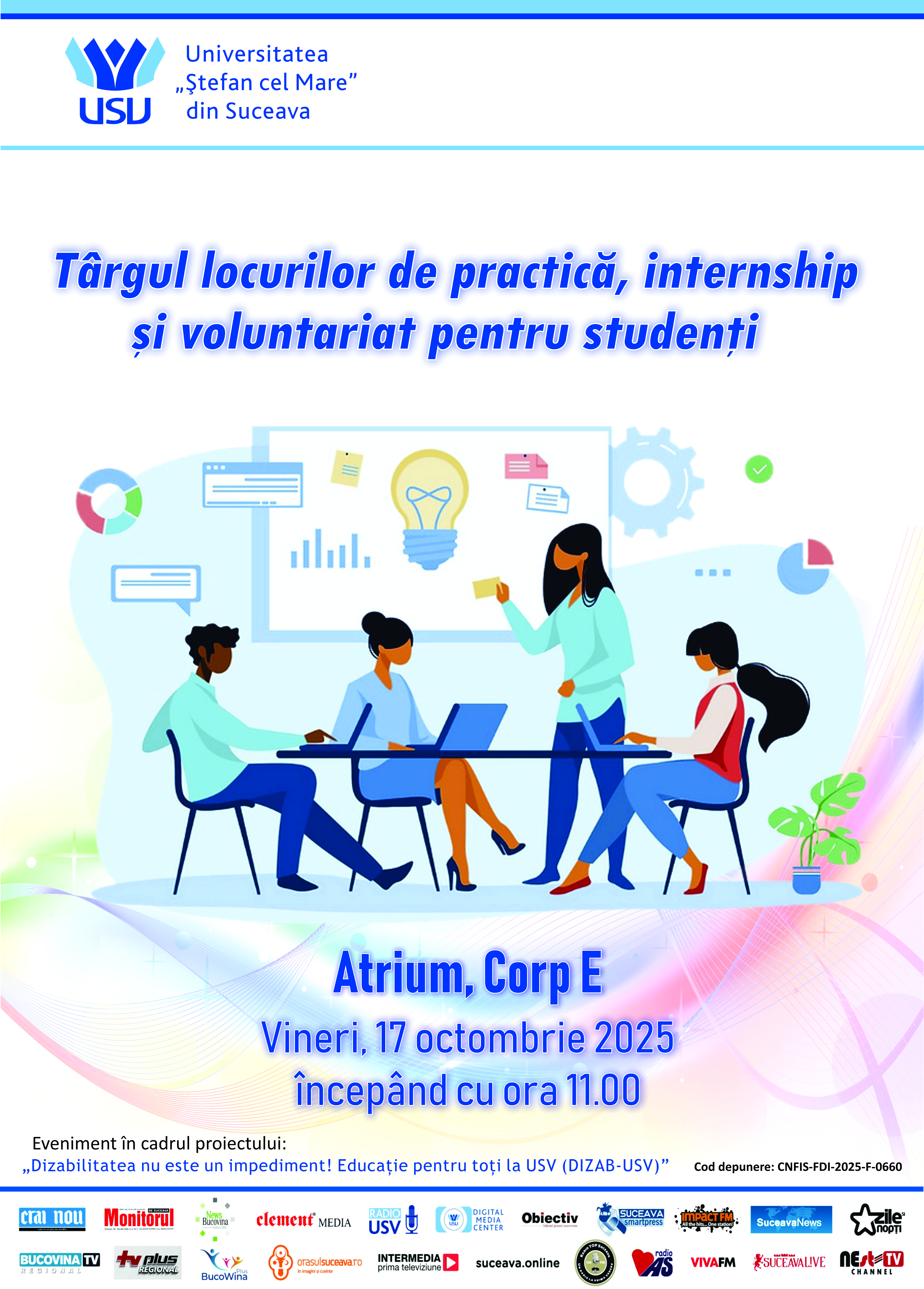 Vineri, 17 octombrie a.c., începând cu ora 11:00, în corpul E, Universitatea „Ștefan cel Mare” din Suceava (USV) organizează evenimentul Târgul locurilor de practică, internship și voluntariat pentru studenți, adresat studenților cu dizabilități și celorlalți studenți de la șase facultăți sucevene: Facultatea de Economie, Administrație și Afaceri,, Facultatea de Inginerie Alimentară, Facultatea de Drept și Științe Administrative, Facultatea de Educație Fizică și Sport, Facultatea de Psihologie și Științe ale Educației și Facultatea de Istorie, Geografie și Științe Sociale.