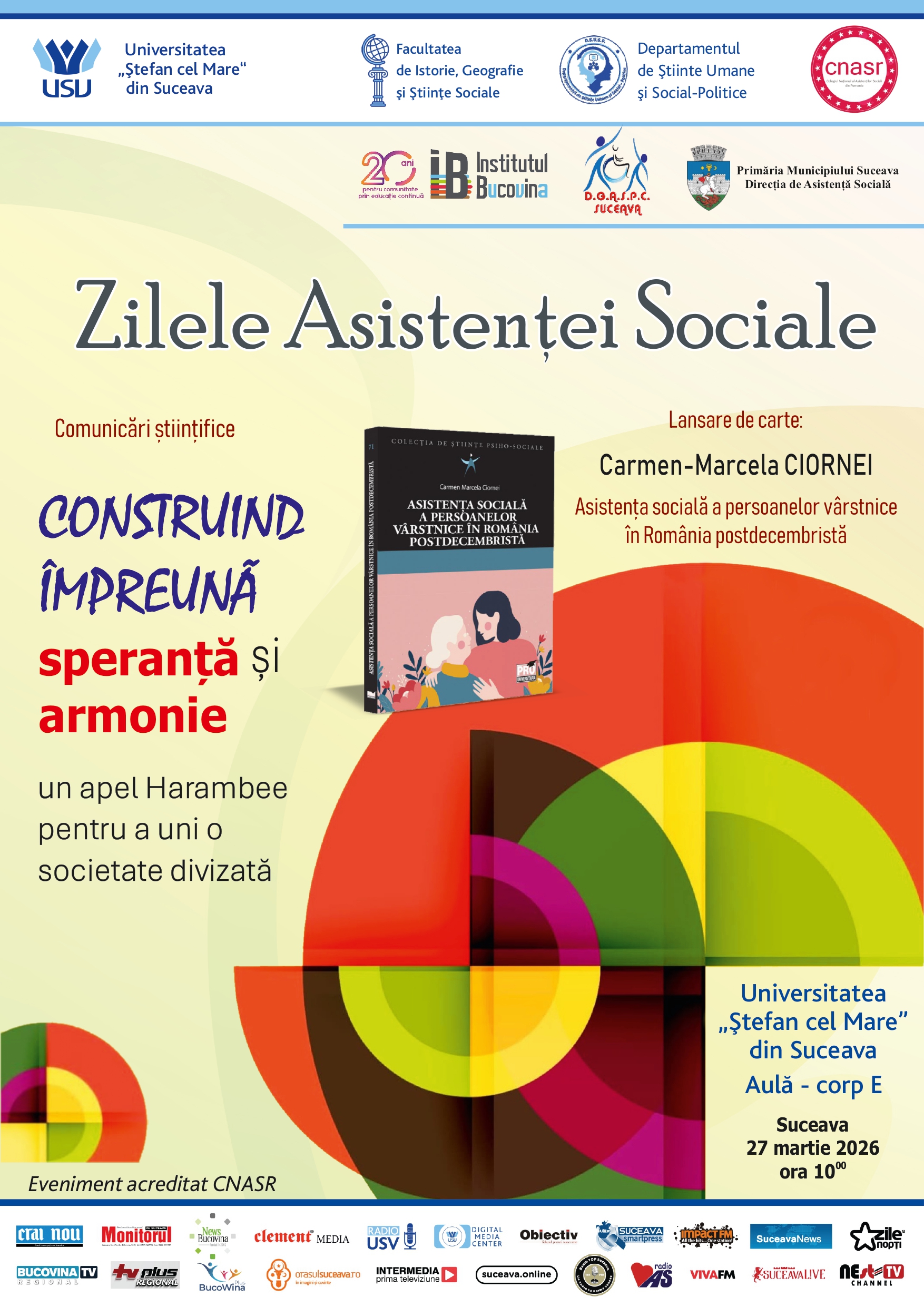 Universitatea „Ștefan cel Mare” din Suceava anunță organizarea evenimentului anual „Zilele Asistenței Sociale”, cu tema „Construind împreună speranță și armonie: un apel Harambee pentru a uni o societate divizată”, care va avea loc vineri, 27 martie a.c., în intervalul 10:00–16:30, în Aula din corpul E. Partenerii evenimentului sunt: Sucursala Teritorială Suceava a Colegiului Național al Asistenților Sociali din România (C.N.A.S.R.), Asociația Institutul pentru Parteneriat Social Bucovina, Direcția Generală de Asistență Socială și Protecția Copilului Suceava și Direcția de Asistență Socială din cadrul Primăriei Suceava.
