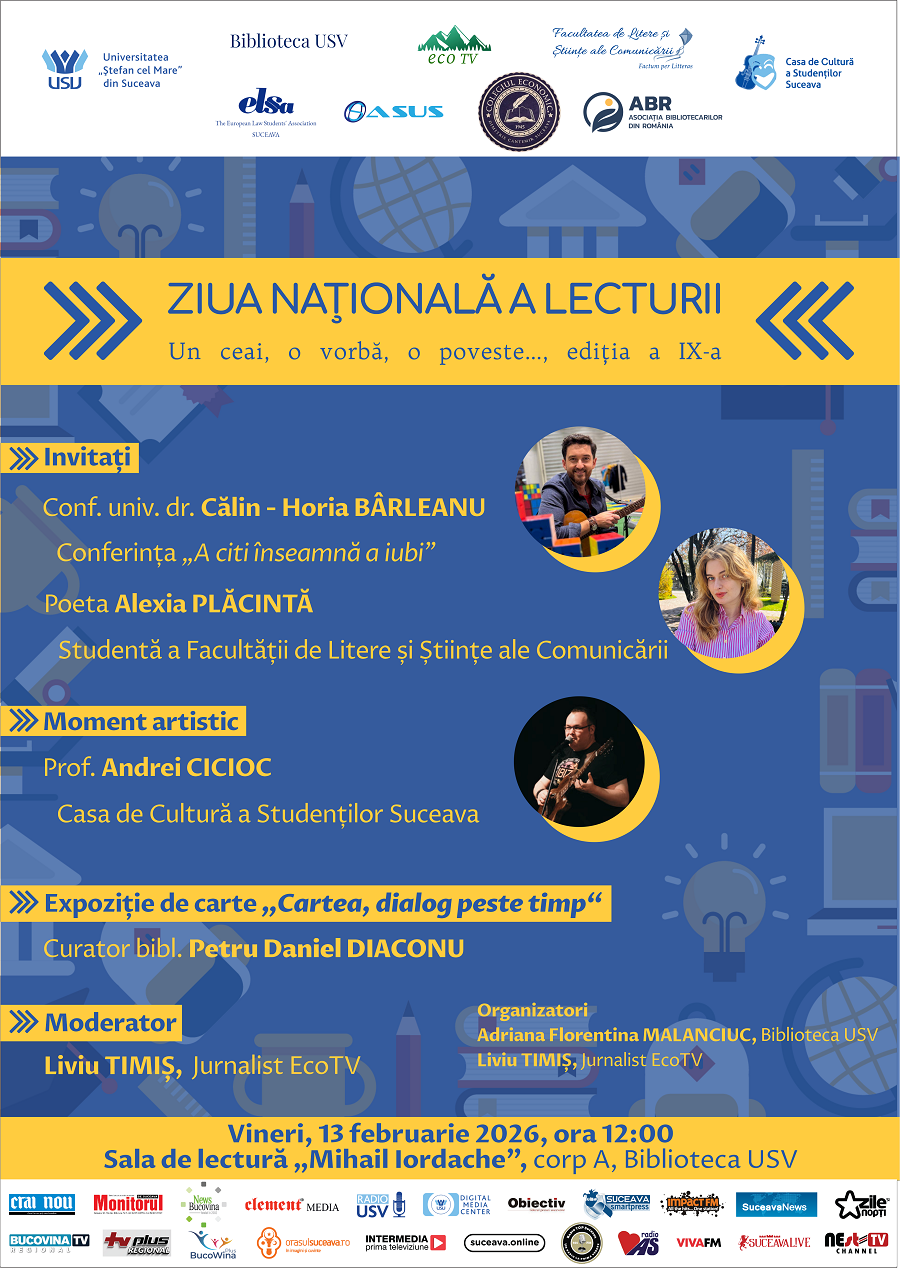Biblioteca USV, în parteneriat cu Eco TV, organizează, vineri, 13 februarie a.c., Ziua Națională a Lecturii, sub semnul celei de a IX-a ediții a rubricii „Un ceai, o vorbă, o poveste…”, devenită o tradiție a universității sucevene.